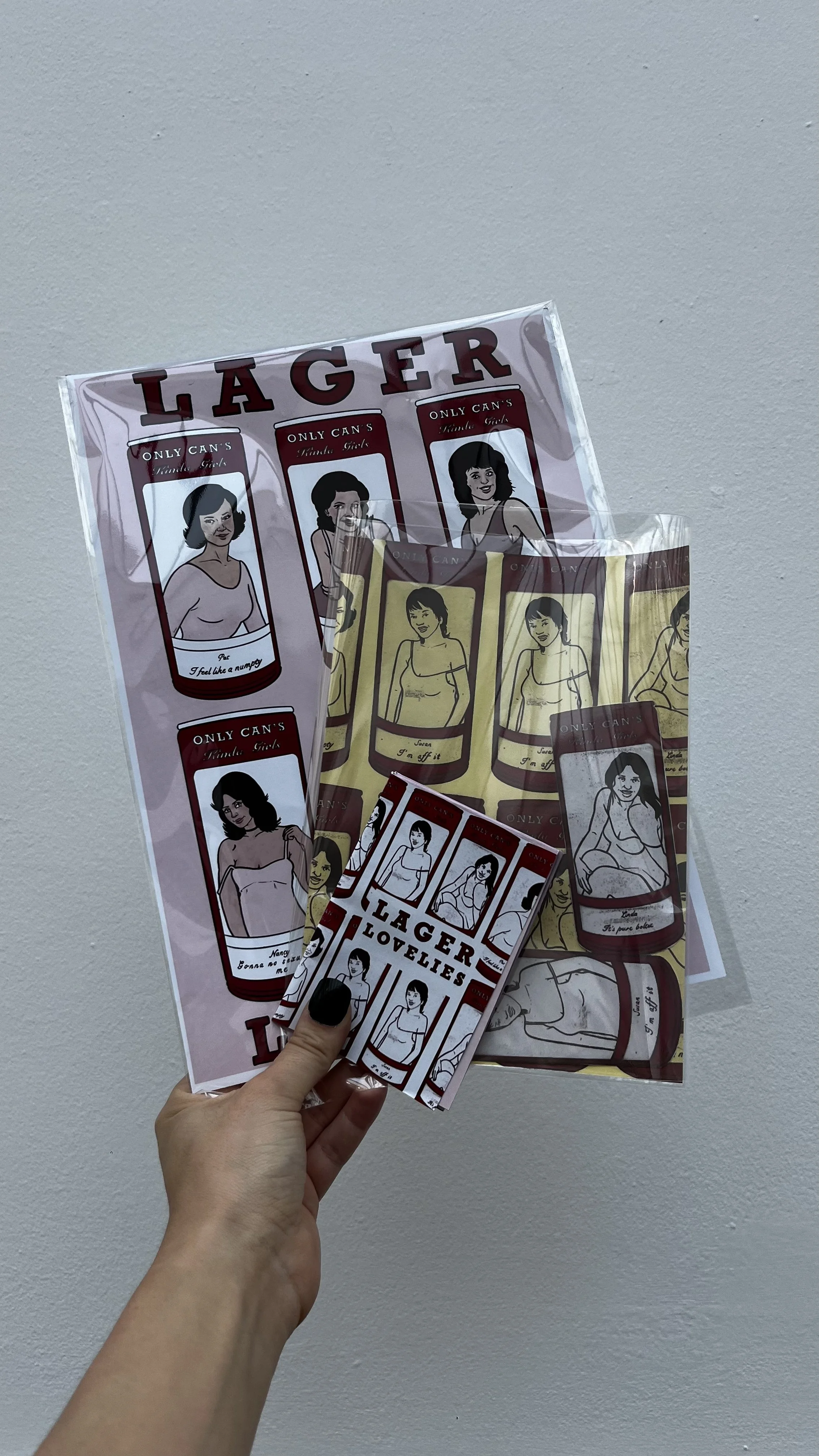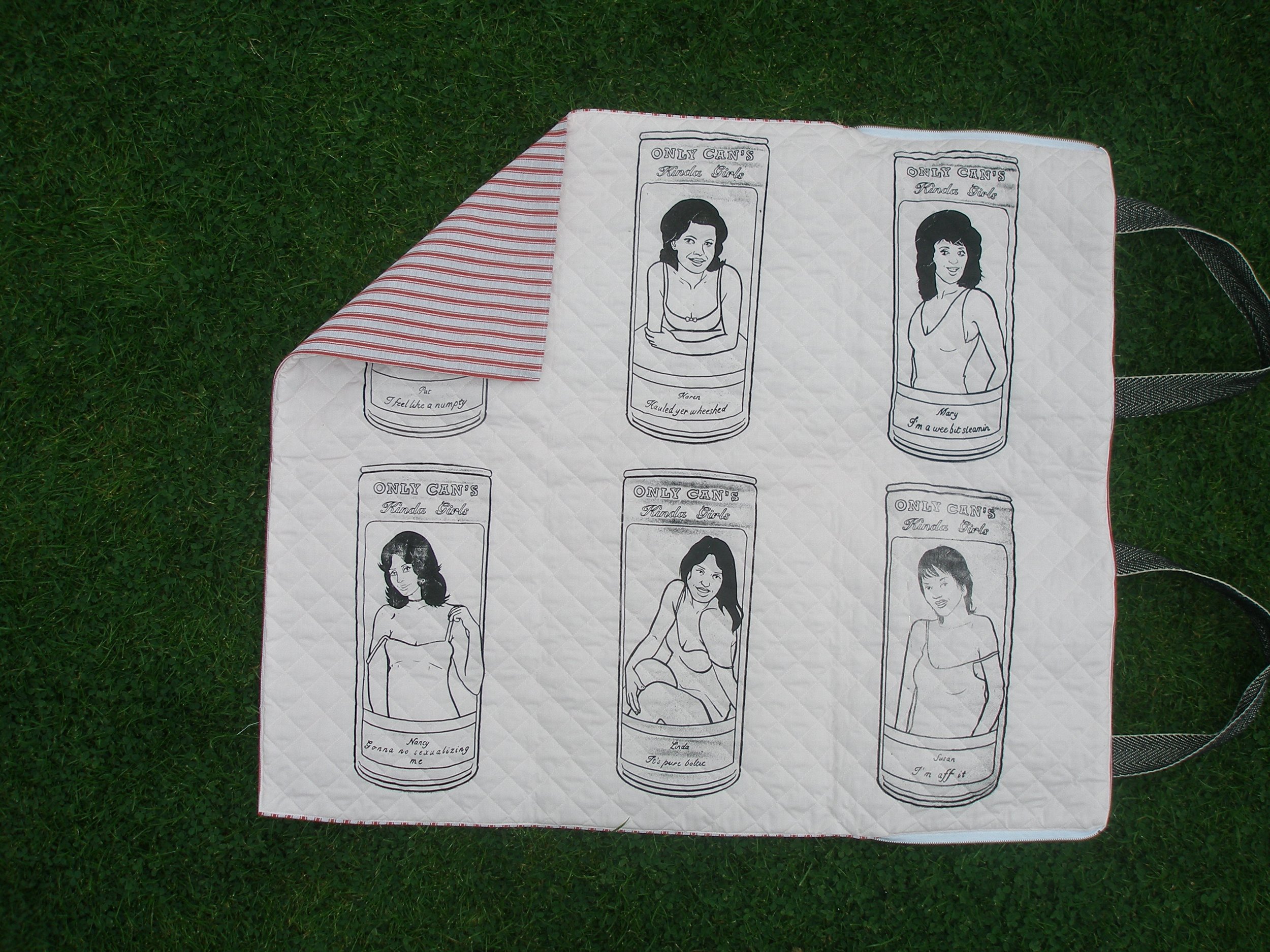 As part of my artwork project "Only Cans," I created a modern satire of Tennent's "Lager Lovelies" campaign (1962 - 1991), which was criticized for objectifying women and was later discontinued. My illustrations aim to challenge historical norms and stereotypes. Inspired by Scottish drinking culture, I transformed the artwork into a printed quilt, fashioned into a bag to symbolize women in a domestic nature. Additionally, I incorporated the idea that a can is a disposable and recyclable object, adding a thought-provoking layer to the artwork. As part of my research, I interviewed one of the campaign models who worked with Tennents from 1988 to 1991 to include phrases on the cans that feature Scottish slang, highlighting the girls' experiences of being embarrassed, having fun, and feeling cold while working on the campaign.